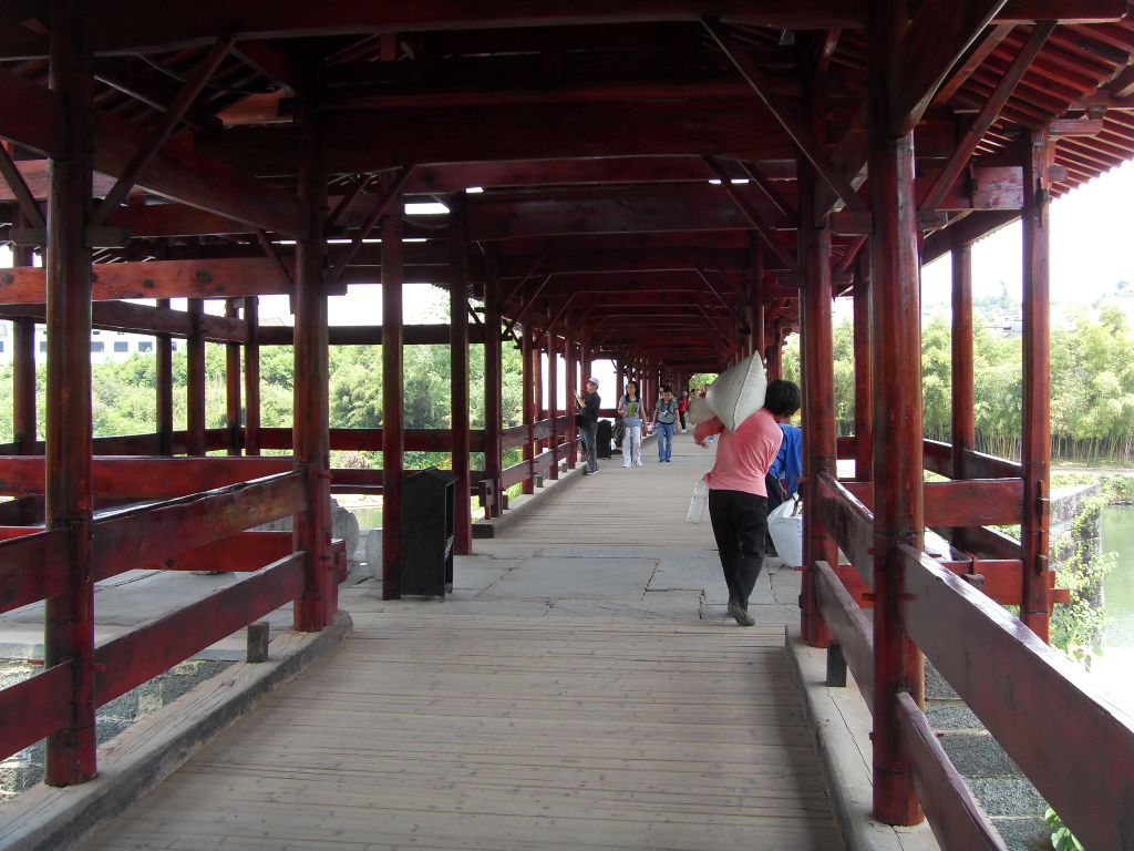 如今,在整个徽州,甚至是全中国,就只剩下一道建于南宋时(1137年),直到今天也被保存得最完整的廊桥,那就是婺源的彩虹桥。廊桥是一种带顶的桥,雨天可供行人歇脚,晴天可以挡挡猛烈的阳光。桥长有140米,由11座廊亭组成,廊亭中还有石桌石凳。全木结构的彩虹桥,年代久远一定需要维修,当初古人建桥时,整座桥没有一点雕梁画栋,就是方便日后可以随时请来木工建造;八百多年以来,历代都有维修,也证实了越是简单实用的工艺,就越容易传承和延续下去。