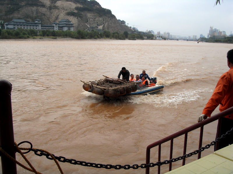 羊皮筏,是古代沿习到现今的摆渡工具。千百年前,住在黄河两岸的居民,就已经懂得钻进充气的牛羊皮胎,浮泅过河。后来为了安全和增大载重量,用坚硬的水曲柳木条以麻绳捆成一个木框,再打横绑上几根圆木棍,把一只只皮胎顺次扎在木排下,就成了可以用来乘人载货的皮筏子。小的可载重两三吨,大的也可以载个十来吨,羊皮筏子体质小而轻,吃水浅,没有触礁搁浅的顾虑,操纵灵活,非常方便,遂成了黄河上游的主要运输工具。